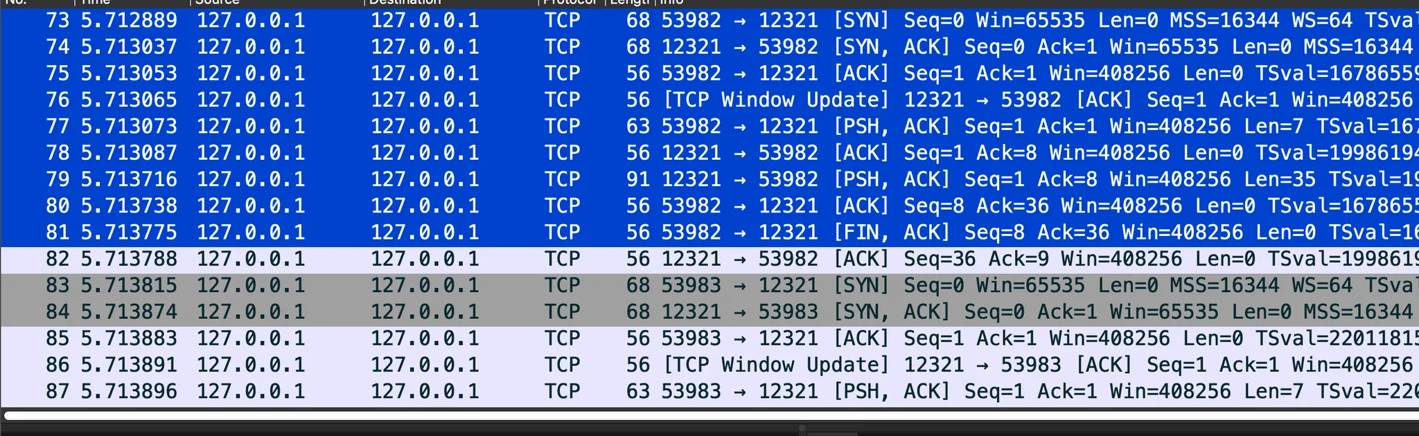 위와 같이 Client 코드를 작성하게 되면, Connect 1회당 통신 데이터 송수신 1회 후 통신이 종료됩니다. 따라서 위의 패킷처럼 데이터를 보낼 때마다 새로운 3-Way-Handshake를 수행하며, 서버의 로컬 포트가 달라지는 것을 볼 수 있습니다. 통신 자체에는 문제가 없지만, 왠지 찝찝합니다. 제가 모르는 OS 내의 문제가 발생할 수 있다는 생각에 다른 방법으로 통신이 유지되도록 하는 방법은 없을까 고민해보았습니다.