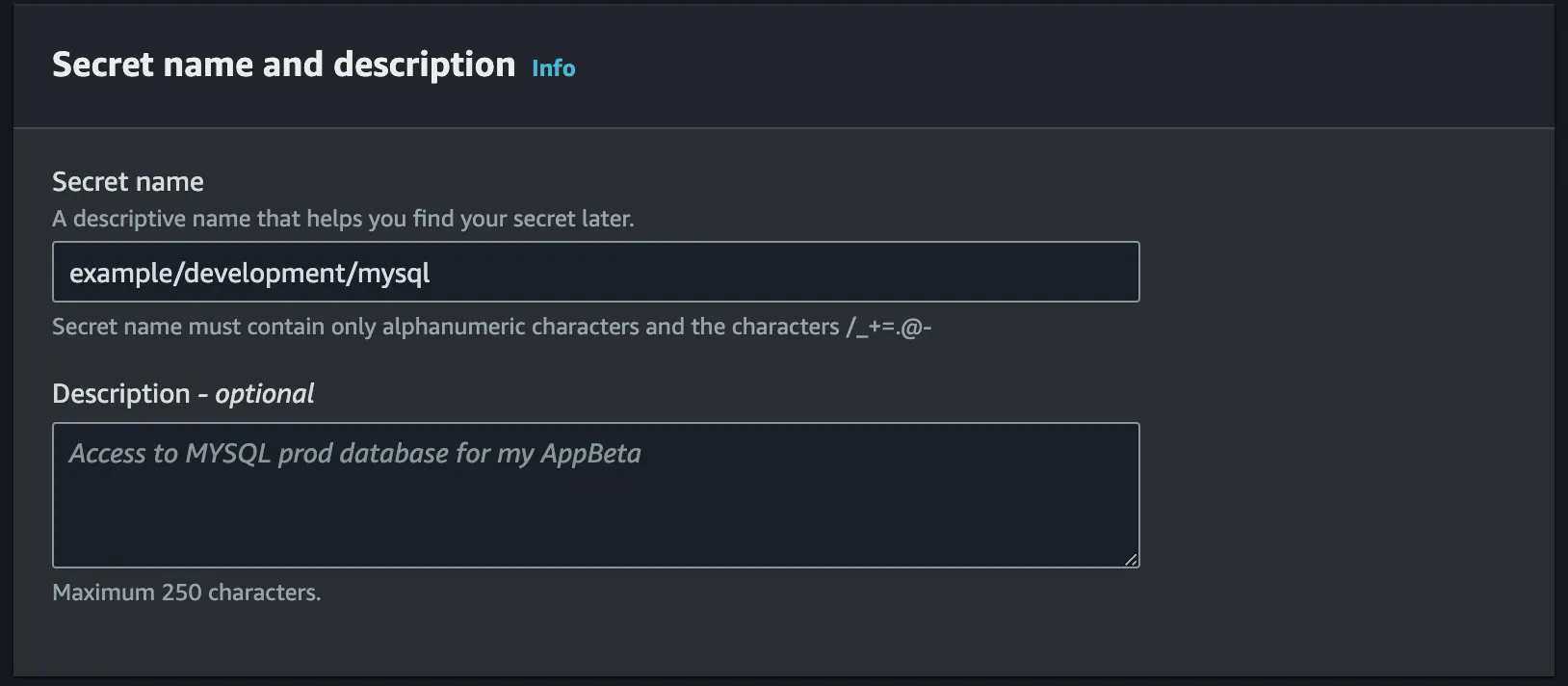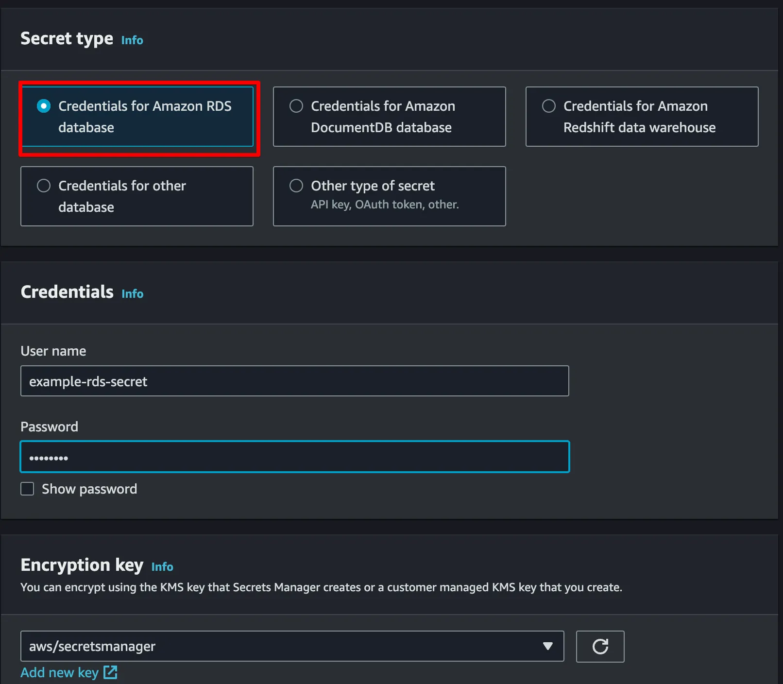 아래와 같이 DB instance 접속 정보에 대한 ID/PW 를 입력하고, 연결할 database instance를 연결 후 생성해주도록 합니다. 저는 RDS 를 선택해주고, example/development/mysql 로 secret_name을 설정해주었습니다.