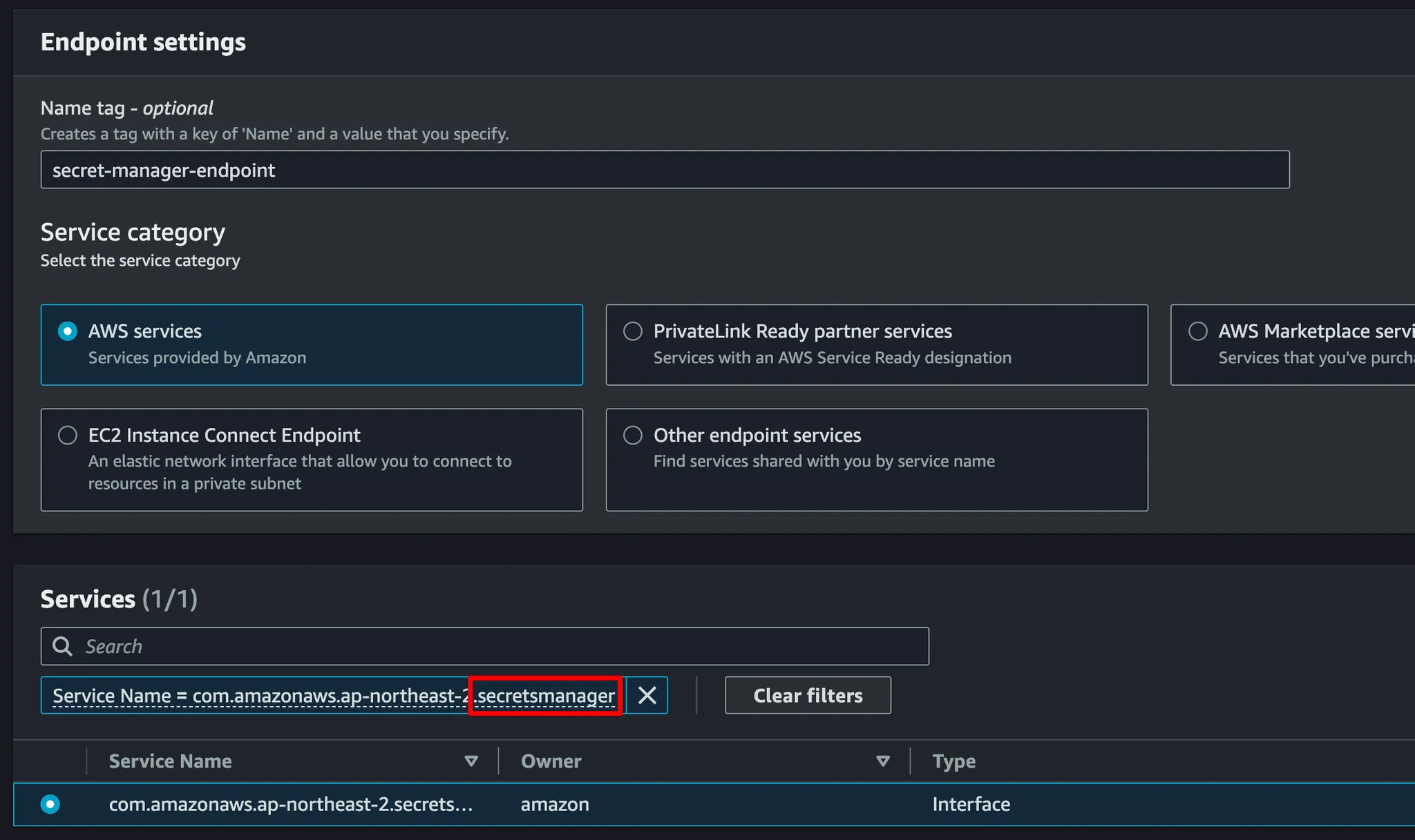 Lambda에서 VPC 외부에 있는 Secret Manager로 접근하기 위해 vpc endpoint를 생성해줍니다.