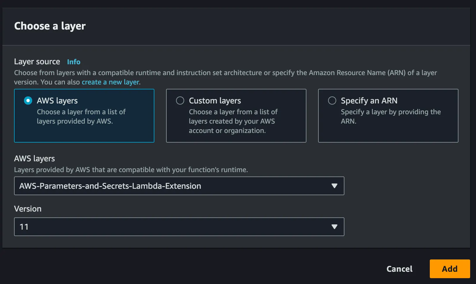 VPC 환경에서 boto3를 활용하여 AWS Secret Manager를 활용하기 위해서는 AWS-Parameters-and-Secrets-Lambda-Extension를 추가해주어야 합니다. 또한 PoC 코드 실행을 위해 pymysql도 추가해주어야 하는데 해당 arn 값은 다음과 같습니다.