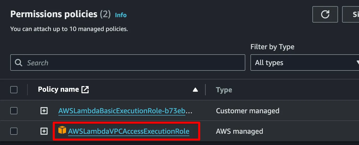 먼저 Lambda에 설정된 Permissions를 확인해보면 어떤 role을 사용하고 있는지 확인할 수 있습니다. 해당 Role에 다음과 같이 AWSLambdaVPCAccessExecutionRole 을 추가해줍니다.