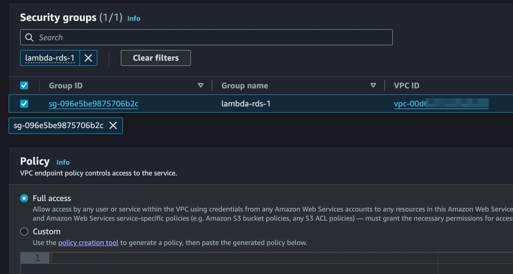 다음으로 endpoint에 접근할 수 있는 security group을 연결해주어야 합니다. 저는 lambda-rds-1 이라는 이름으로 지어주었고, in/out 은 0.0.0.0/0 으로 모두 오픈해보았습니다.