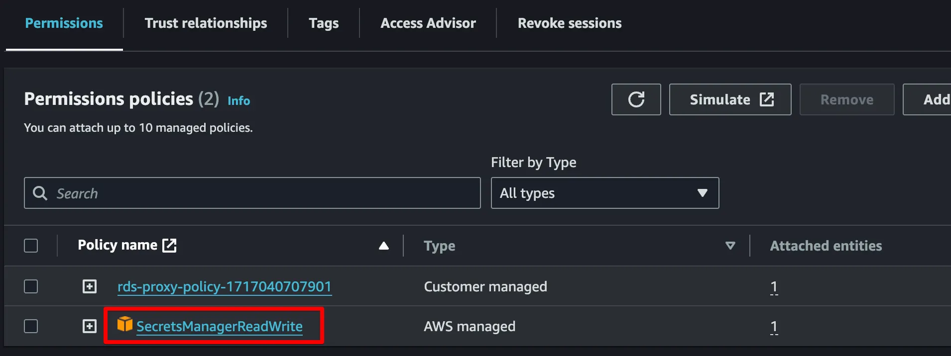 IAM Role이 자동으로 생성되었지만, 여기서 Secret Manager를 사용하도록 우리가 설정해주었기 때문에, RDS Proxy 역시 Secret Manager에 접근할 수 있어야 합니다. 따라서 아래와 같은 설정을 추가해주어야 합니다.
