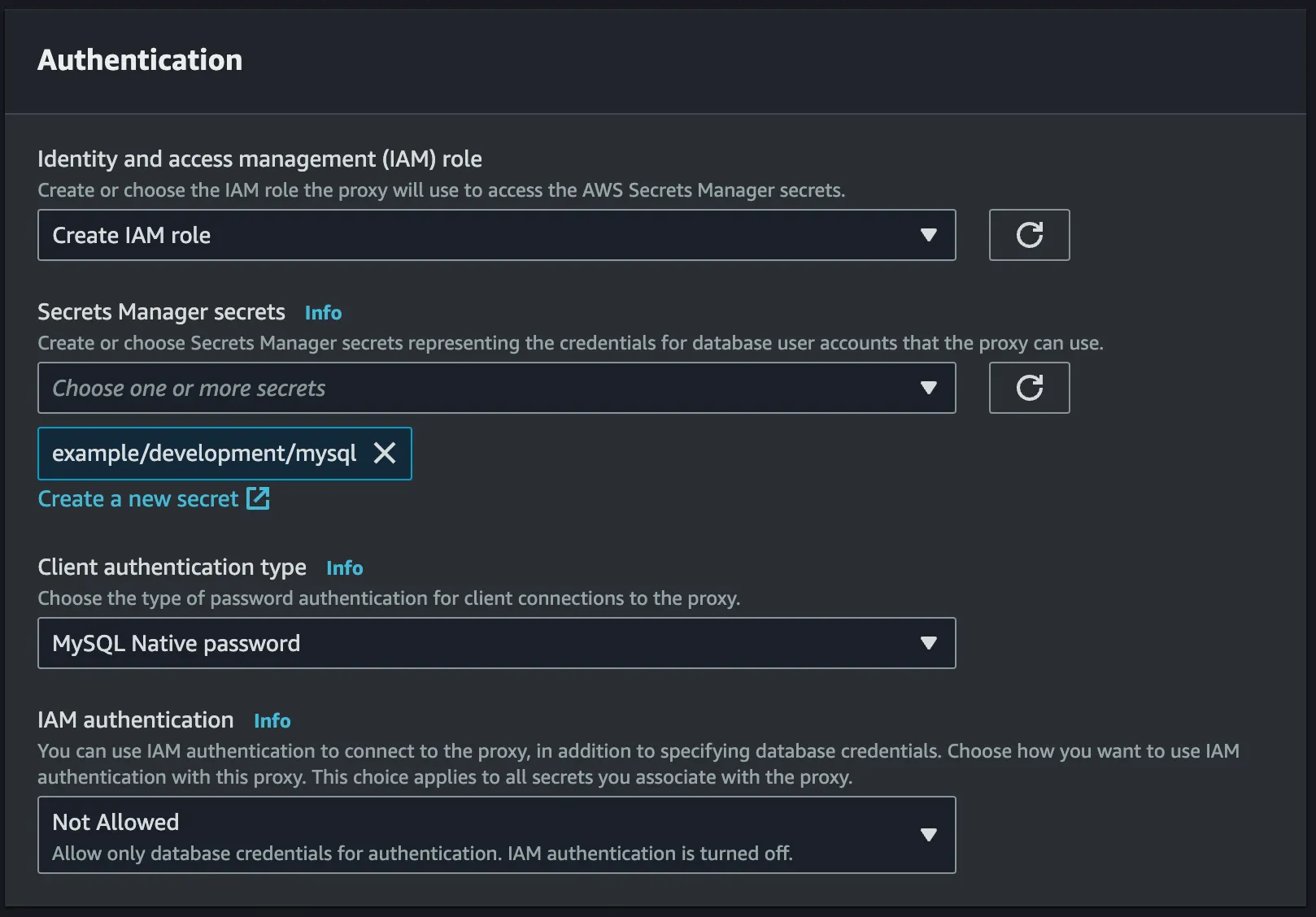 이후 RDS Proxy에서 사용할 IAM Role과 Secret 값을 생성해주어야 합니다. 기존의 role이나 secret을 사용해도 되지만, 해당 포스트에서는 새로 생성해주도록 하겠습니다.