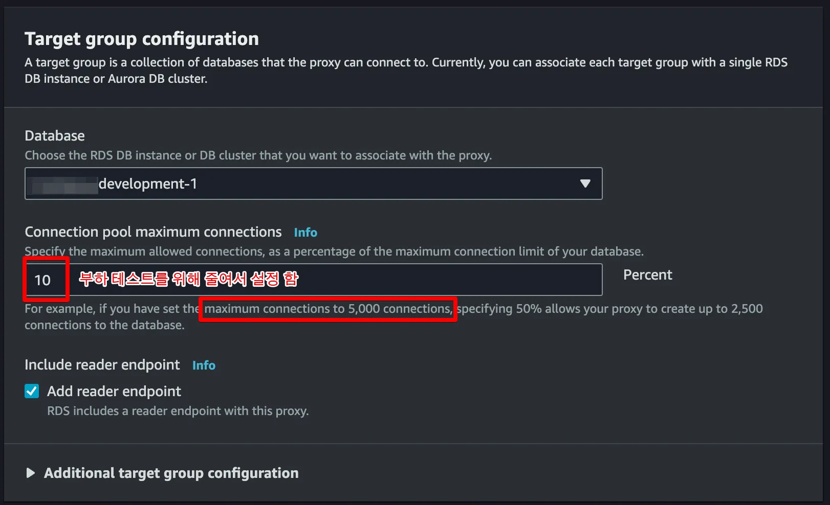 아래와 같이 원하는 rds database instance 를 선택하고 connection pool을 선택합니다. RDS Proxy에서 컨트롤 할 수 있는 최대 연결 수는 5000개이지만, 만약 부하테스트의 목적이라면 이를 줄여서 설정하면 됩니다. 저는 10% (500)개로 줄여서 설정해보았습니다.