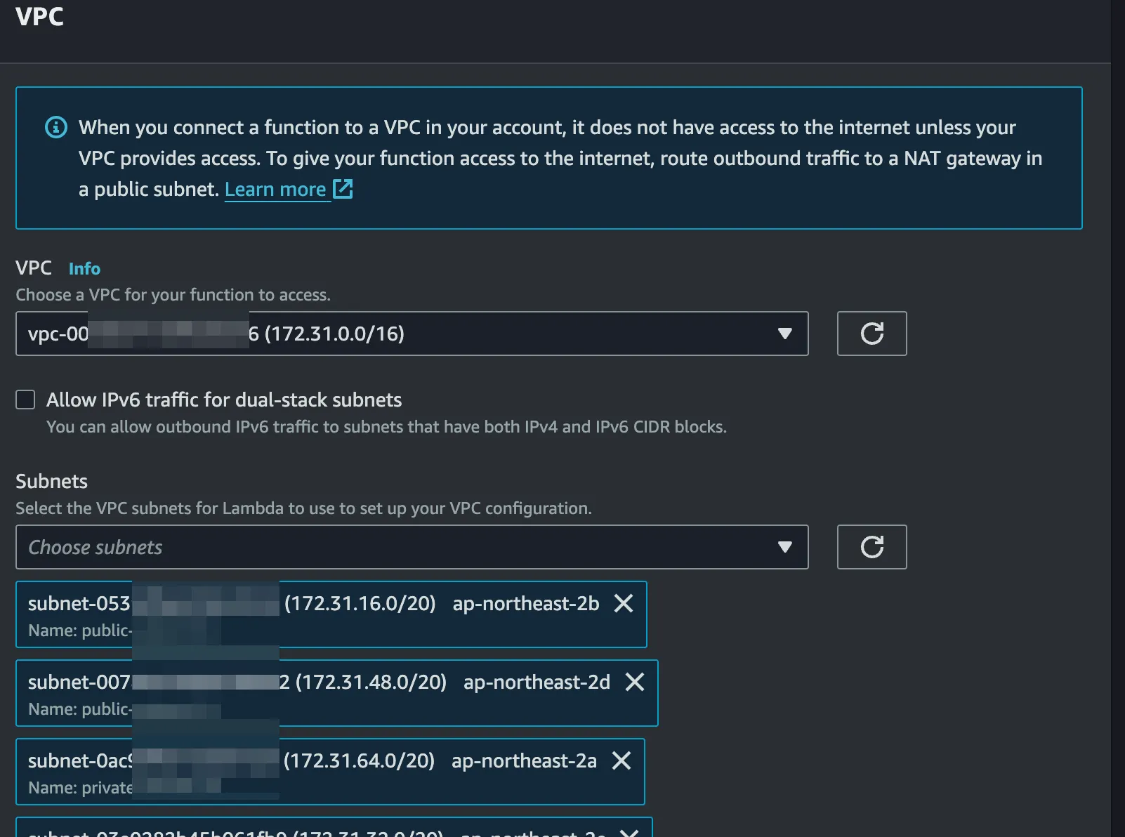 Lambda에서 Configuration으로 들어가 VPC를 설정해줍니다.