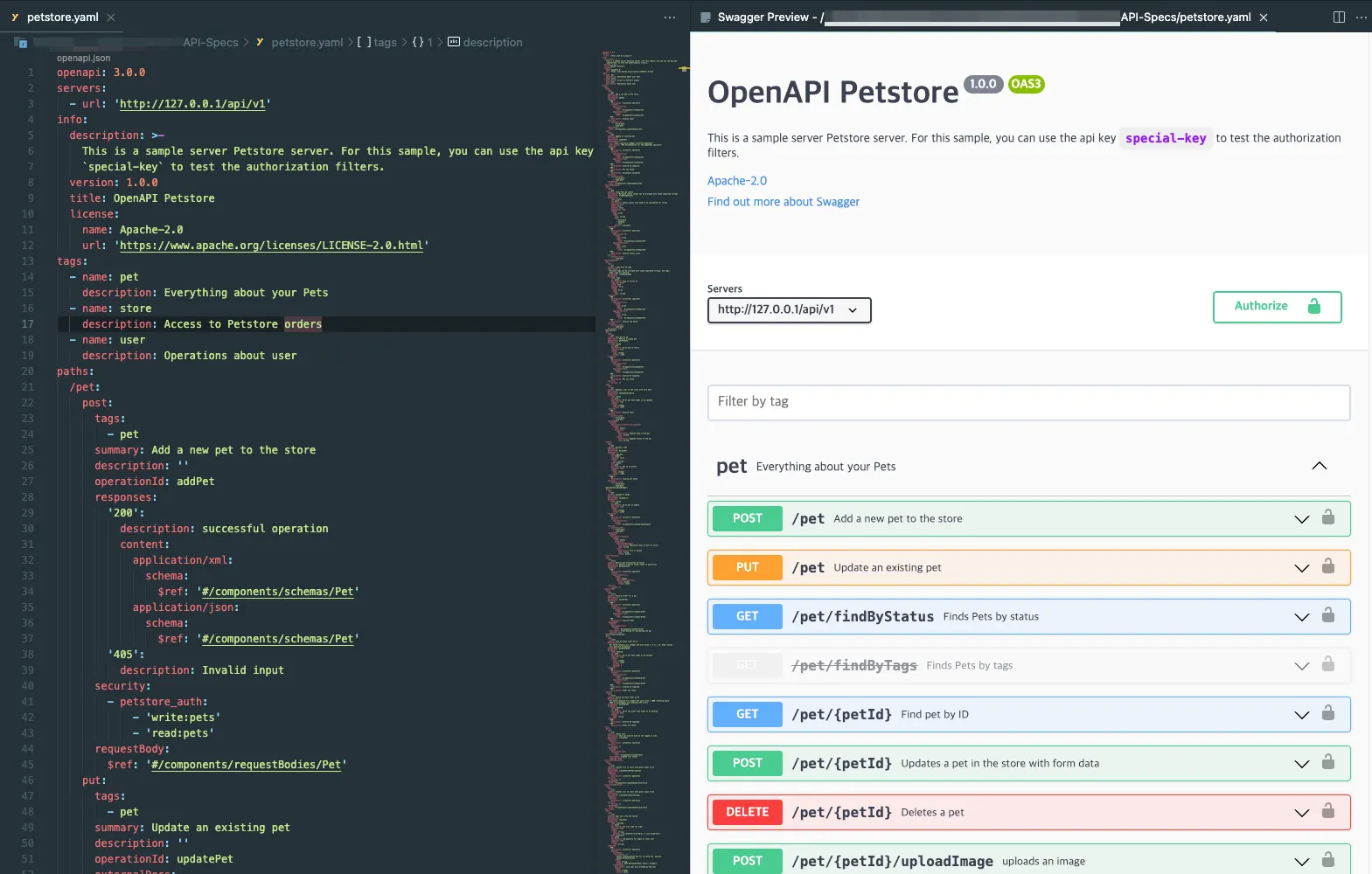 OpenAPI Spec은 Yaml 혹은 Json 형태로 작성이 가능합니다. 저는 이번에 Yaml 파일로 API 스펙을 작성해보는 연습을 해보고자 합니다. 아래의 예시는 openapi에서 제공하는 예시입니다. 자세한 예시를 보고 싶으시면 아래의 링크를 참고하시면 됩니다.