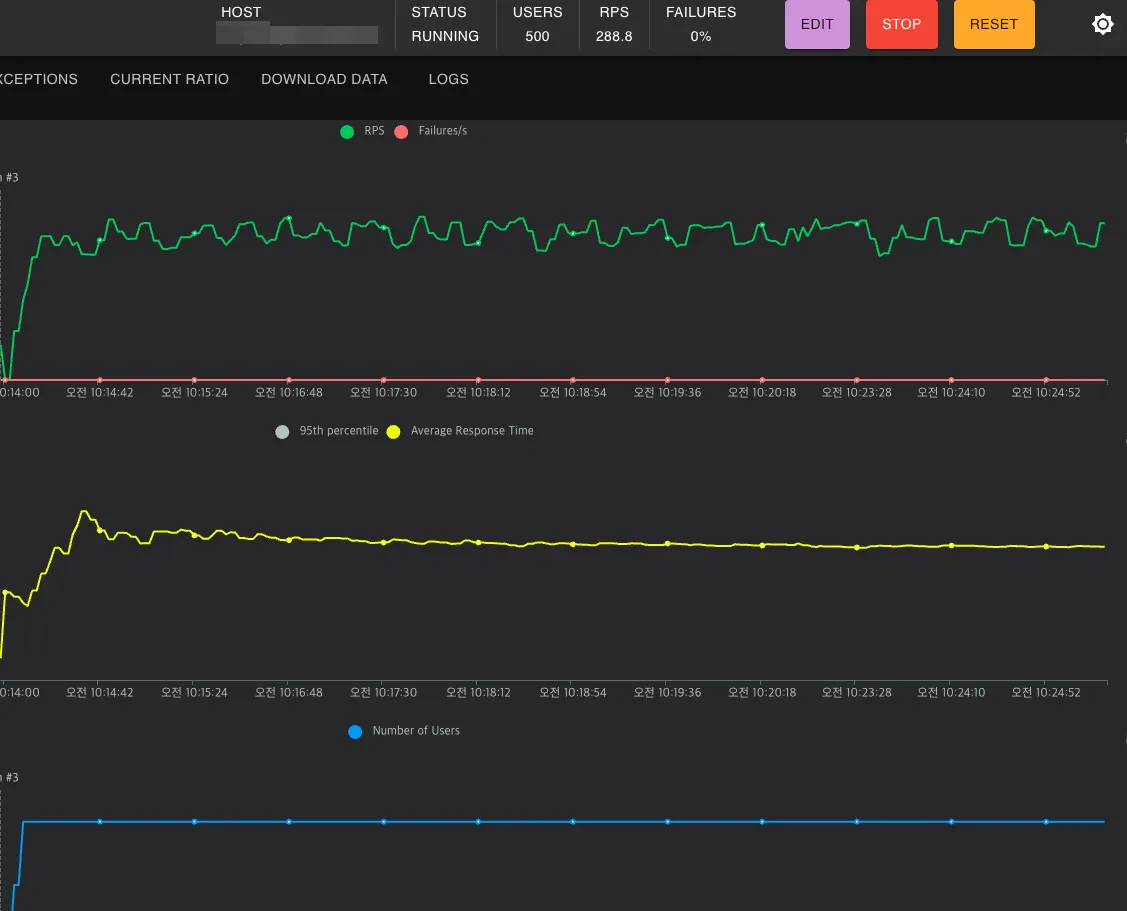 Locust 세팅은 동일하게 했습니다. 유저 수가 동일하되, 성능의 차이가 어떻게 나타나는지 확인하기 위함입니다.