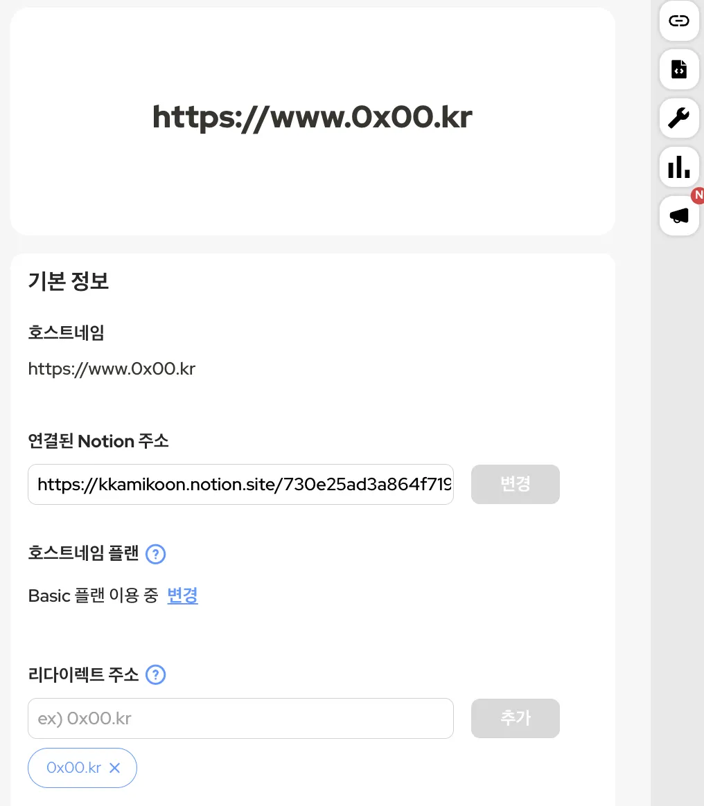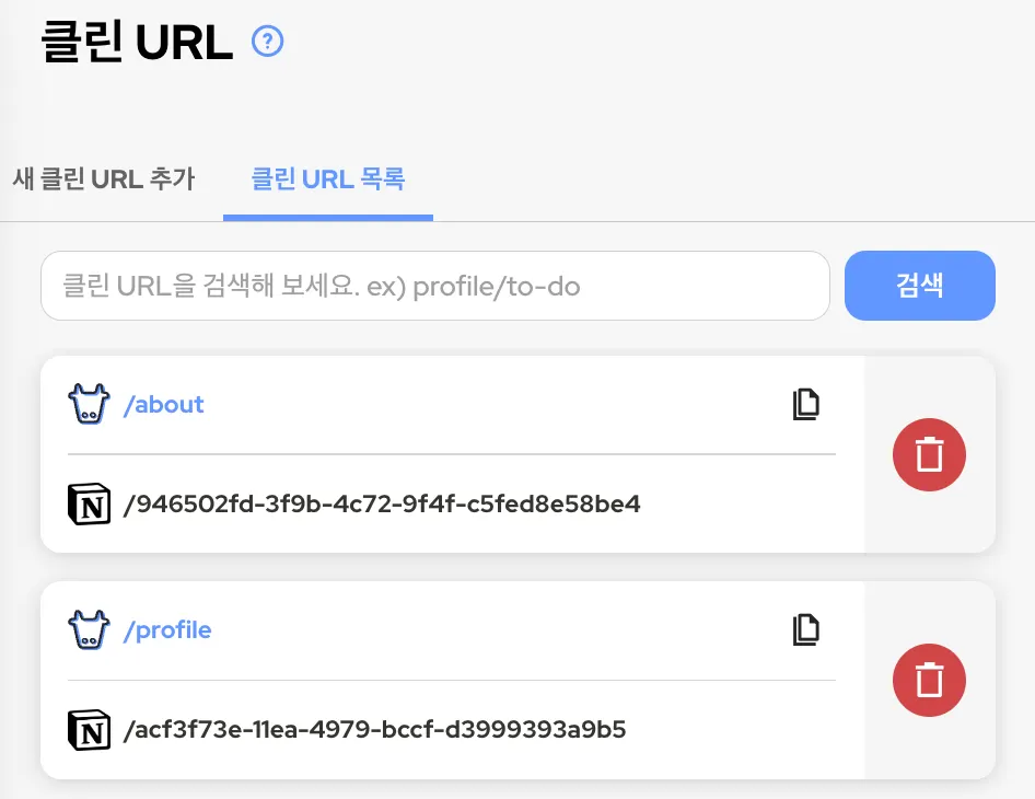 기본적으로 Notion 링크를 사용하는 것이기 때문에 URL이 위와 같이 UUID 값입니다. 만약 profile이나 about 같은 간단한 소개글을 작성하는 대표 페이지의 URL이 UUID 형태의 path를 가지게 되면 조금 아쉬울 것 같습니다. 해당 기능을 통해 URL을 적절히 수정할 수 있다는 점이 매력적입니다.