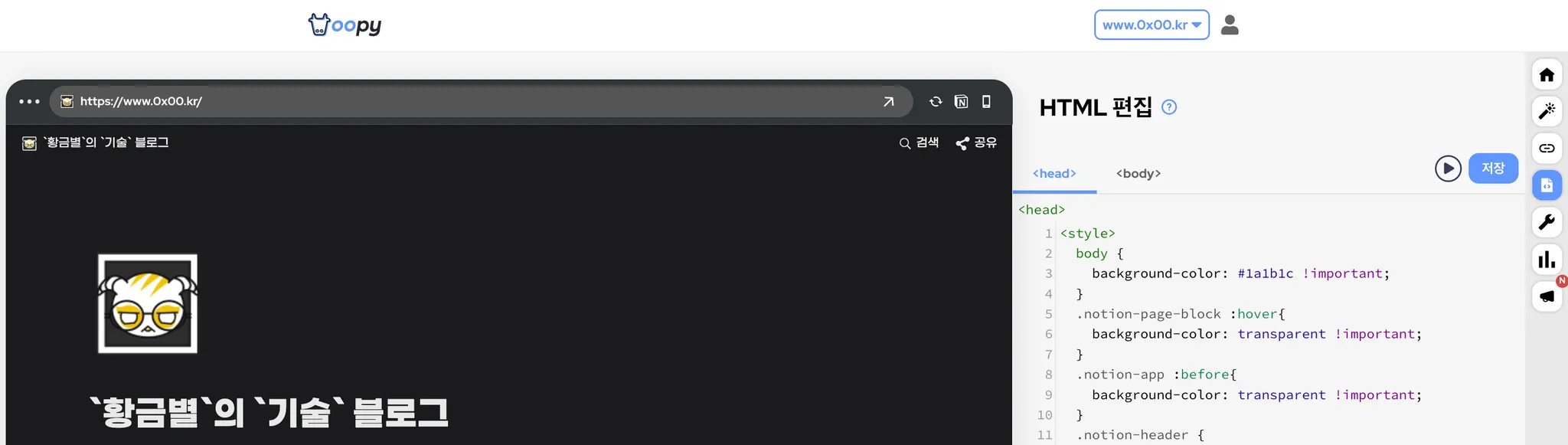 블로그에서 기본적으로 HTML 편집이 가능합니다. 아래의 사진처럼 노션에 적절하게 영역을 구분하여 글을 작성하게 되고, 필요한 부분(코드 박스, 배경 색깔, 배경 이미지 등)을 일부 커스텀할 수 있었습니다.