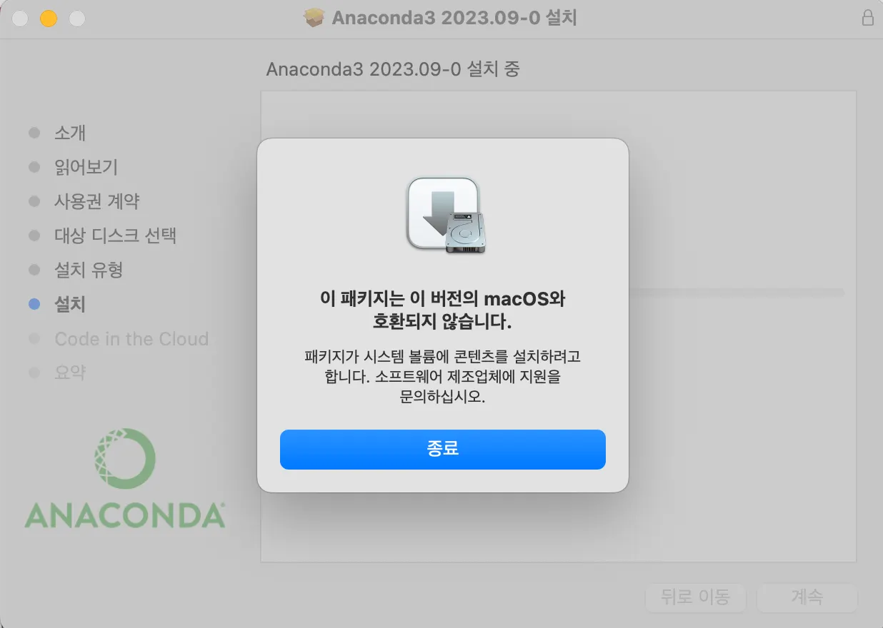 이 패키치는 이 버전의 macOS와 호환되지 않습니다. 메시지가 확인되고 설치가 종료될 경우 아래와 같은 메시지가 나옵니다. 때문에 이 이슈를 해결하기 위해서는 repo URL로 접속하여