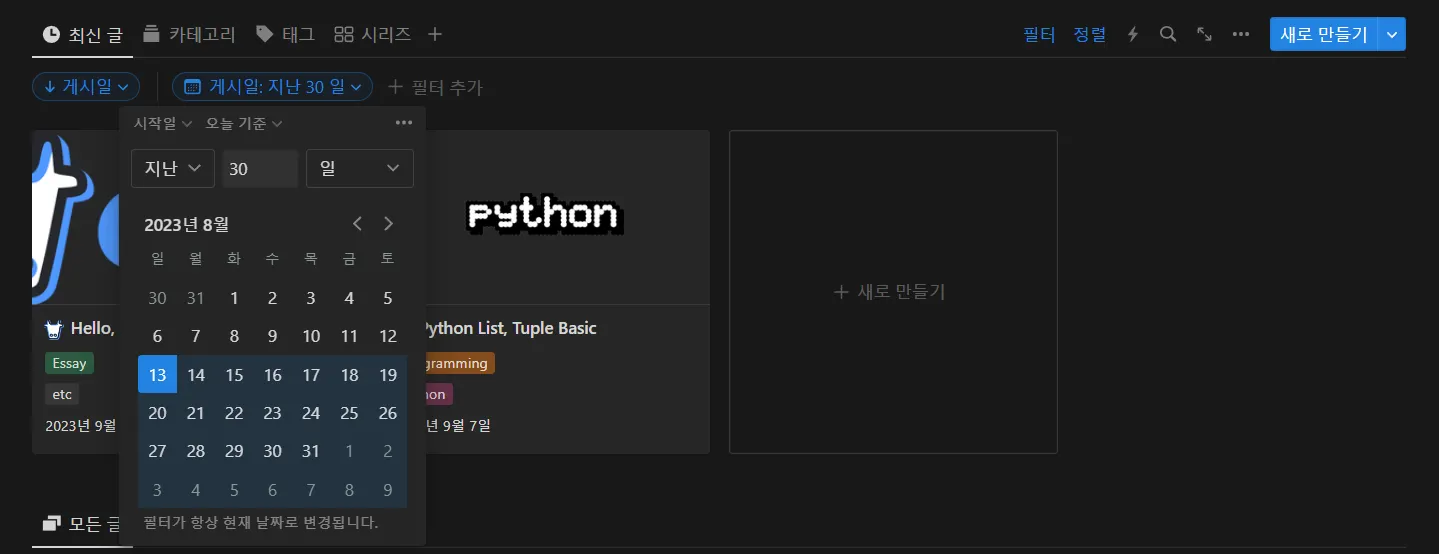 그리고 포스트의 경우 최신글, 카테고리, 태그, 시리즈로 구분하고자 데이터베이스를 생성하였고, 데이터베이스 내에 여러 글을 추가한 후 게시일(실제로 게시글이 작성된 날짜) 속성을 새로 추가해주었습니다.