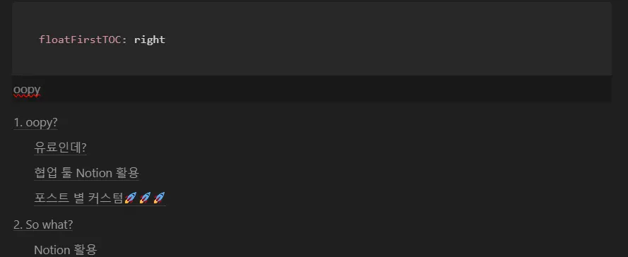 아래의 yaml 설정을 Notion 포스트 가장 위쪽에 두고, 바로 아래 목차를 생성합니다.