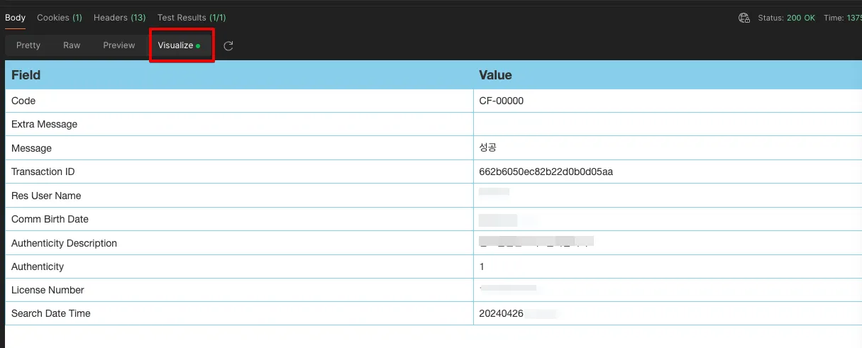 API 응답 값의 정합성 때문에 URI encoding 하여 반환한다고 하면, 다음과 같은 응답값으로 보이게 됩니다. 이런 형태로 나온 데이터를 그때 그때 디코딩과 Jsonify 하기에는 후작업이 불편합니다. 이러한 불편함을 해결하기 위해서는 Postman의 test script를 활용해볼 수 있습니다.