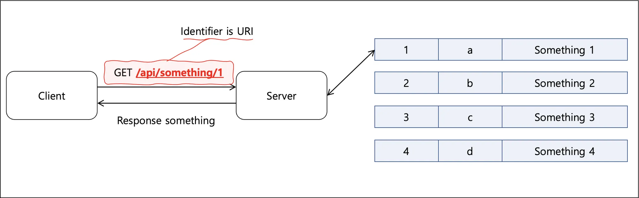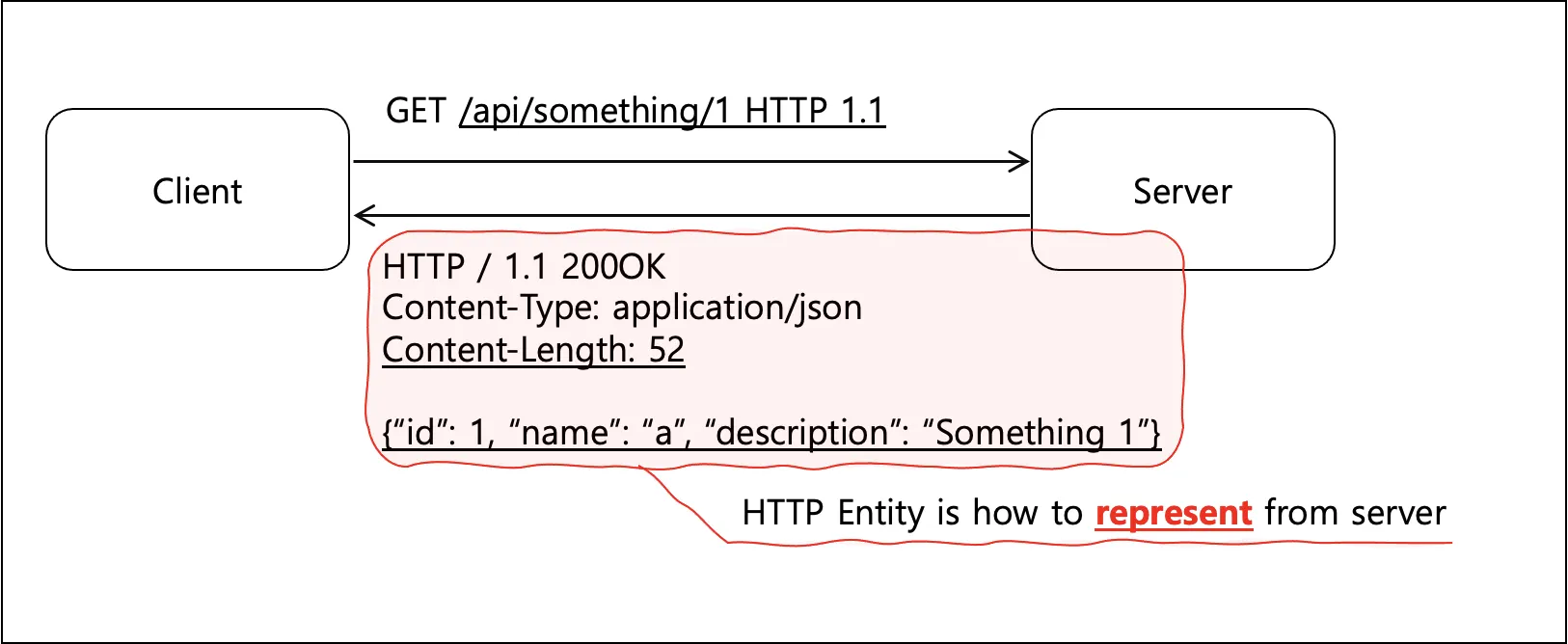 위와 같이 특정 server에서 특정 자원(something 중 1번)을 지정하여 요청하게 되면, Server는 HTTP Entity를 이용하여 자원에 대한 상태(status)를 표현(represent)할 수 있습니다.