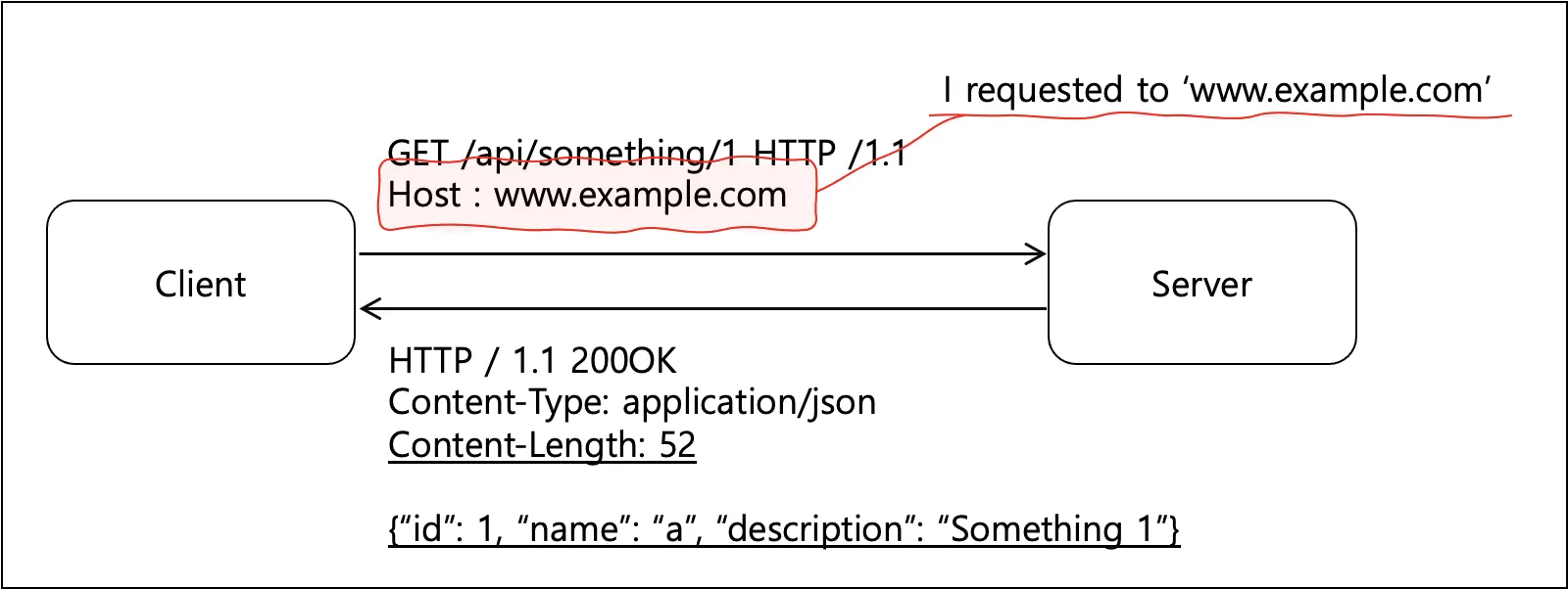 아래의 그림에서, HTTP의 형태로 API를 호출할 때 Header에서 Host를 예로 들어보겠습니다. Host에서는 내가 어디로 요청을 보낸 것인지 스스로 자신의 메시지를 설명할 수 있어야 한다는 뜻으로 해석이 가능합니다. Response에서도 마찬가지로 이러한 헤더 정보를 통해 자신의 메시지가 어디서 어떤 목적으로 전송되는지 확인이 가능할 수 있어야 한다는 제약조건입니다.